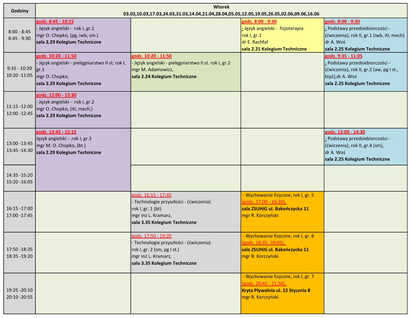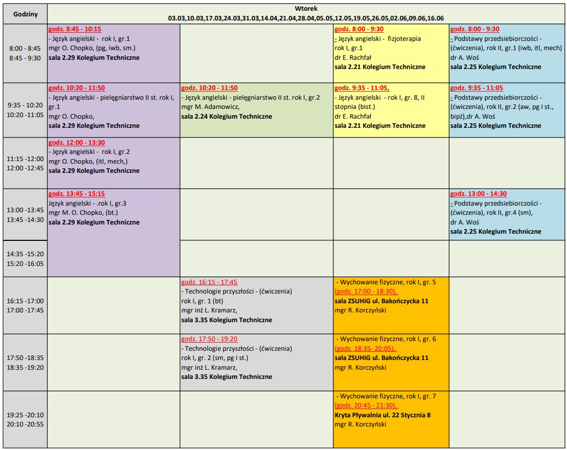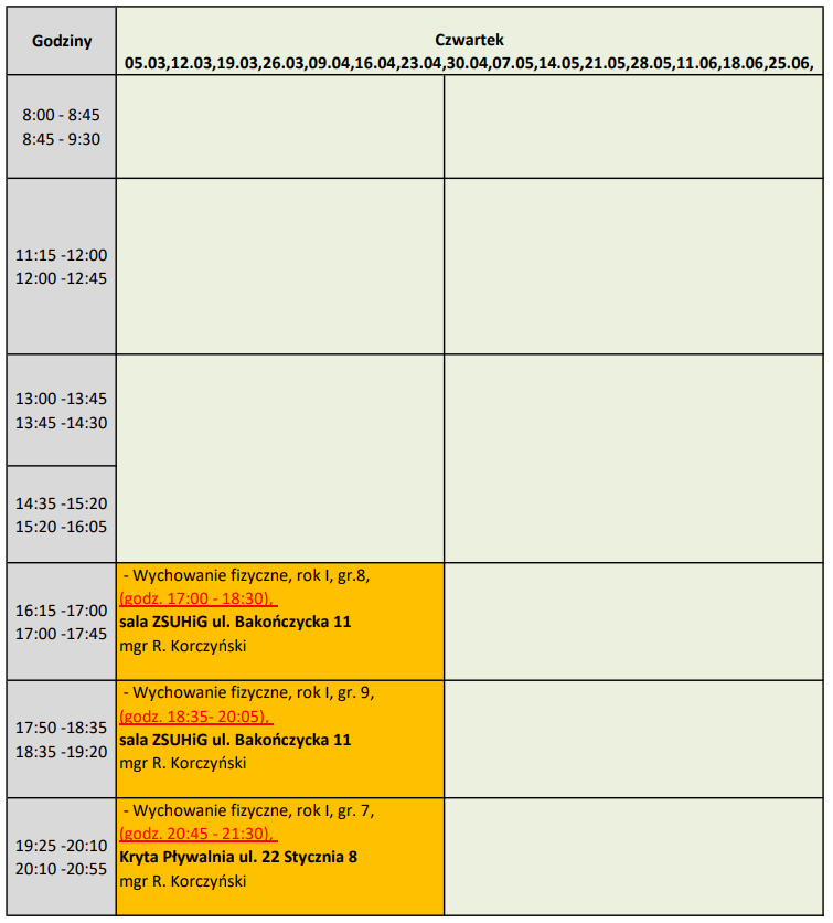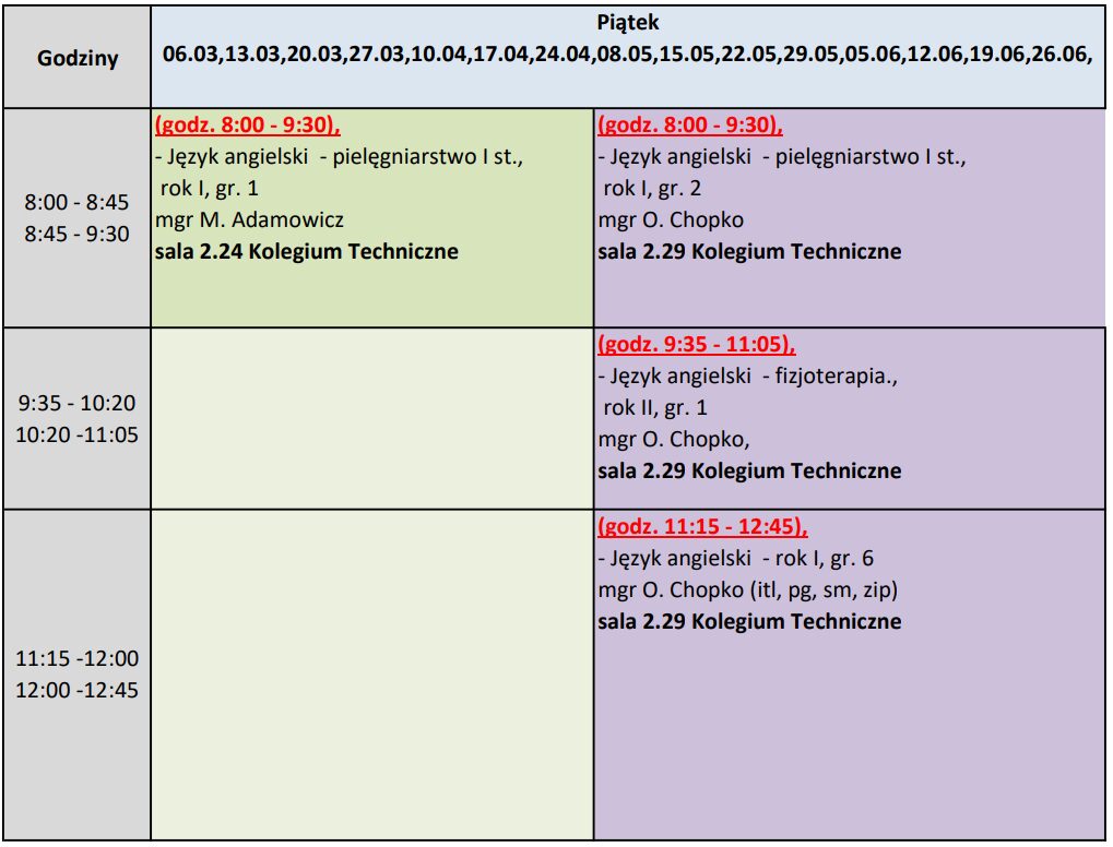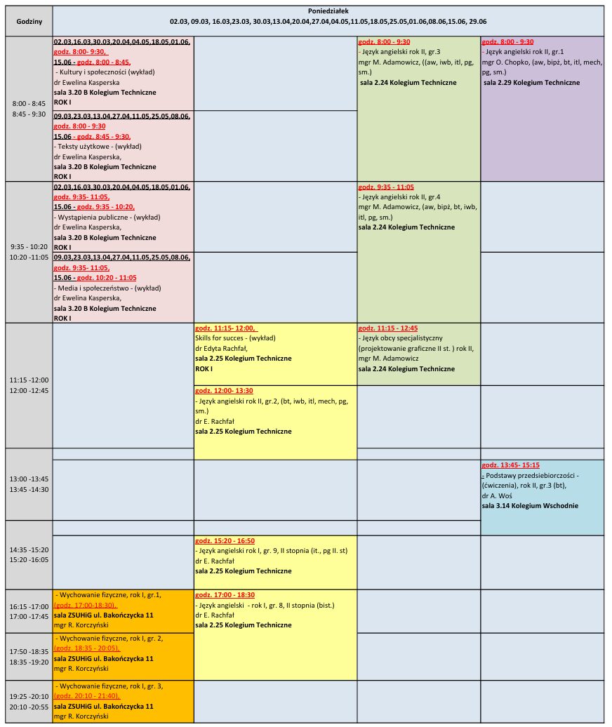 Grafik zajęć ogólnouczelnianych na semestr letni roku akademickiego 2025/2026 Poniedziałek Wtorek Środa Czwartek Piątek